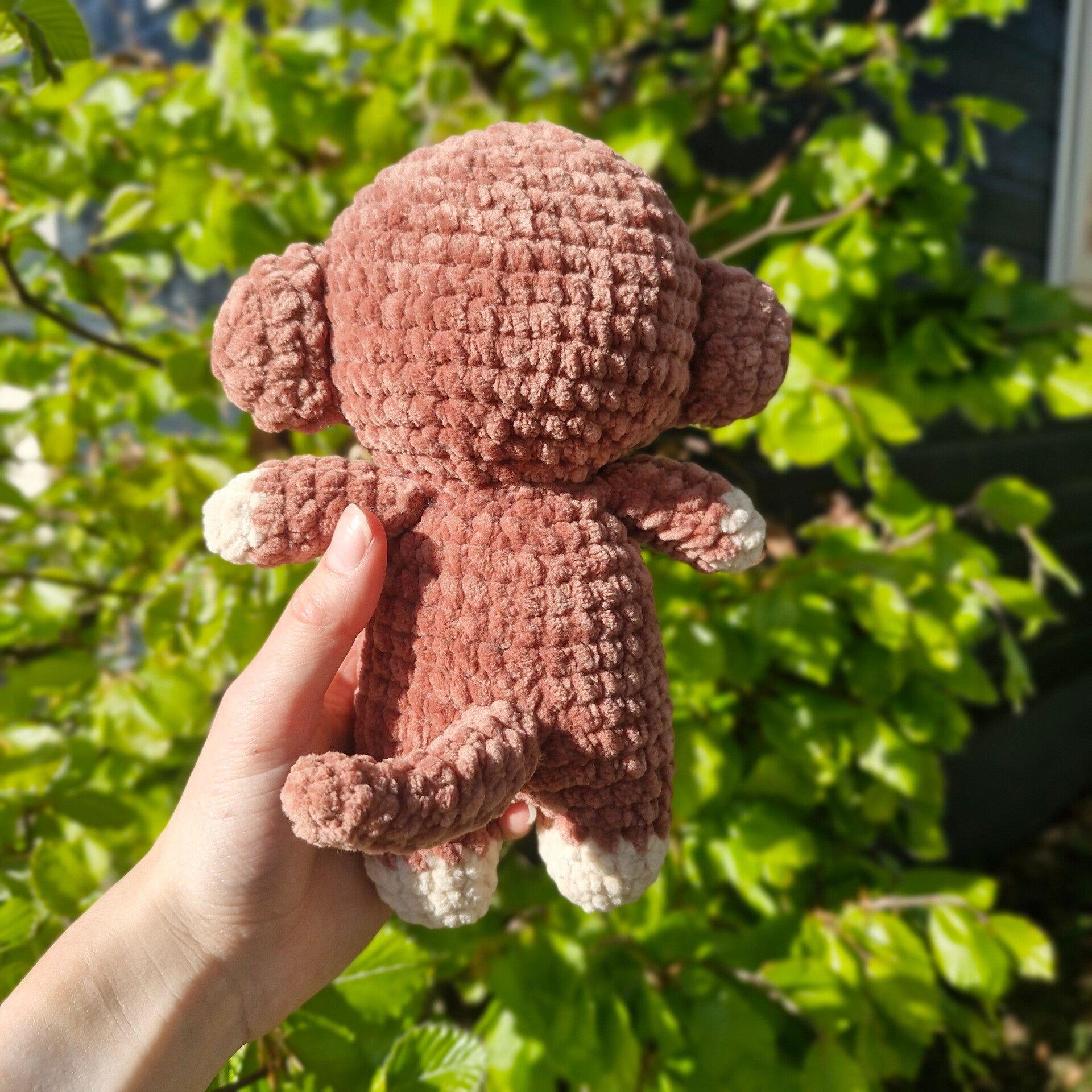 Dit is Moos, een nieuwsgierig gehaakt aapje dat graag overal bij is. Met zijn zachte uitstraling en speelse karakter is hij een gezellig maatje voor elk moment.